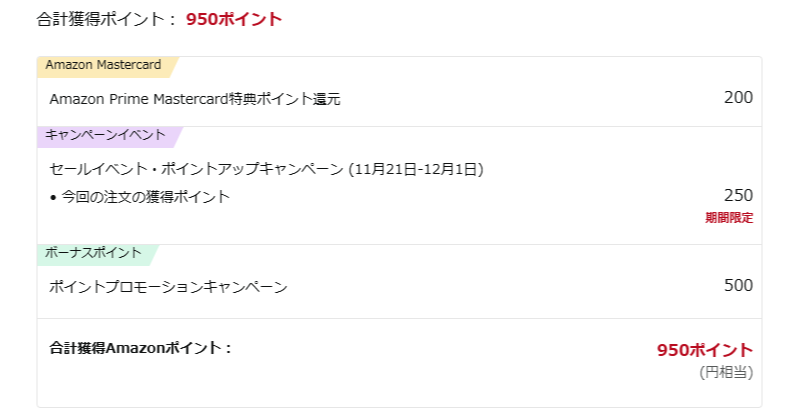 試しに1万円分のApple Gift Card (Eメール送信タイプ)で確認したところ、私の場合は「Amazon Prime Mastercardの特典」「ブラックフライデーのポイントアップ」「Apple Gift Card購入の5%」で950ポイントになりました。