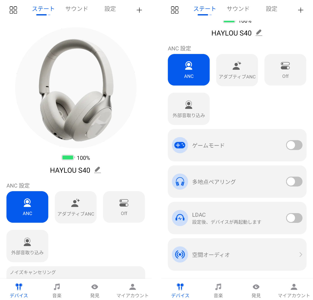 ANCの設定のほか、ゲームモード、LDAC、空間オーディオの設定などができます。
