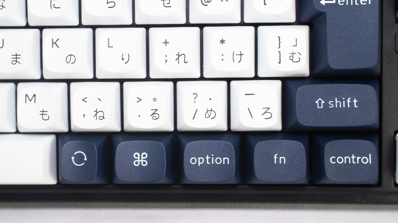 変換キー・無変換キーと左側のOptionキー(Windowsキー)が1Uサイズになっており、その分だけスペースキーが大きめです。