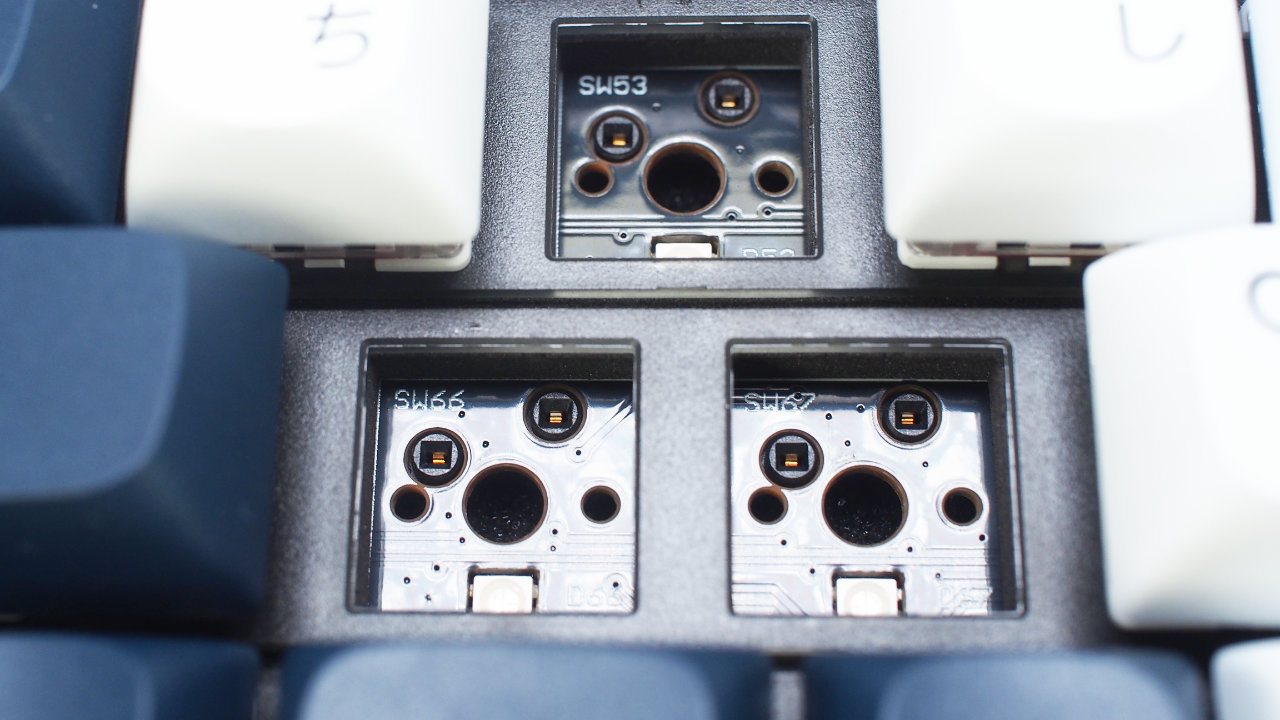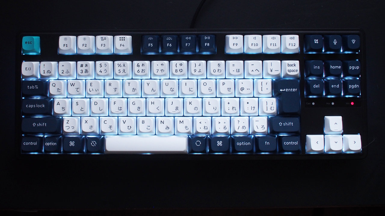 キーキャップは白と濃紺の爽やかなカラーリング、OSAと呼ばれるプロファイルのキーキャップは丸みがあってかわいらしさもありますが好みが分れるポイントだと思います。