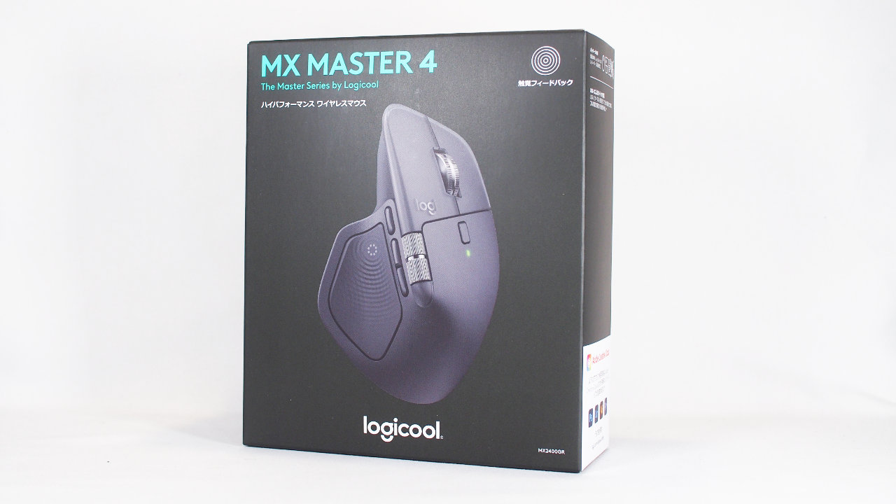 パッケージはロジクールらしい黒基調に、ブランドカラーともいえる水色で「MX MASTER 4」と表記されています。