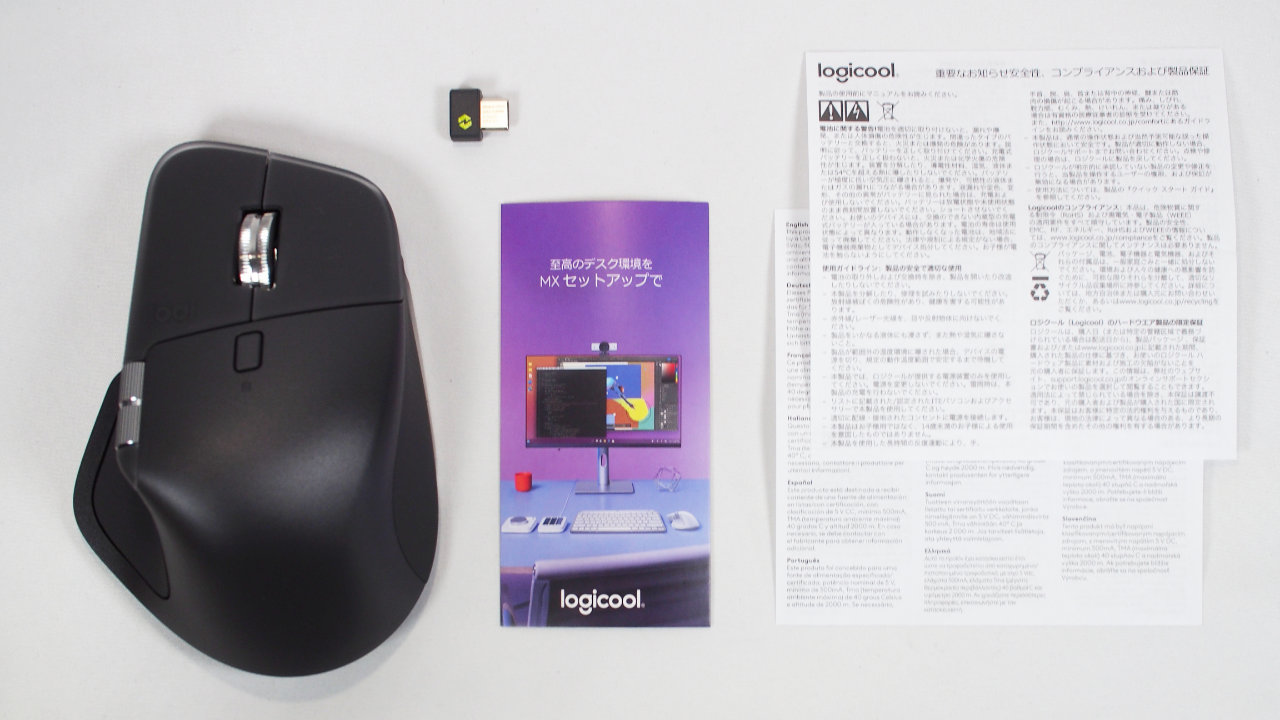 MX Master 4本体のほかは、Logi Boltレシーバー、カード、保証に関する紙(2枚)だけです。