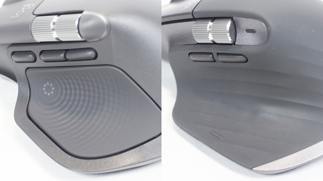 MX Master 3Sに比べてサイドホイール(サムホイール)の露出面が増えています。