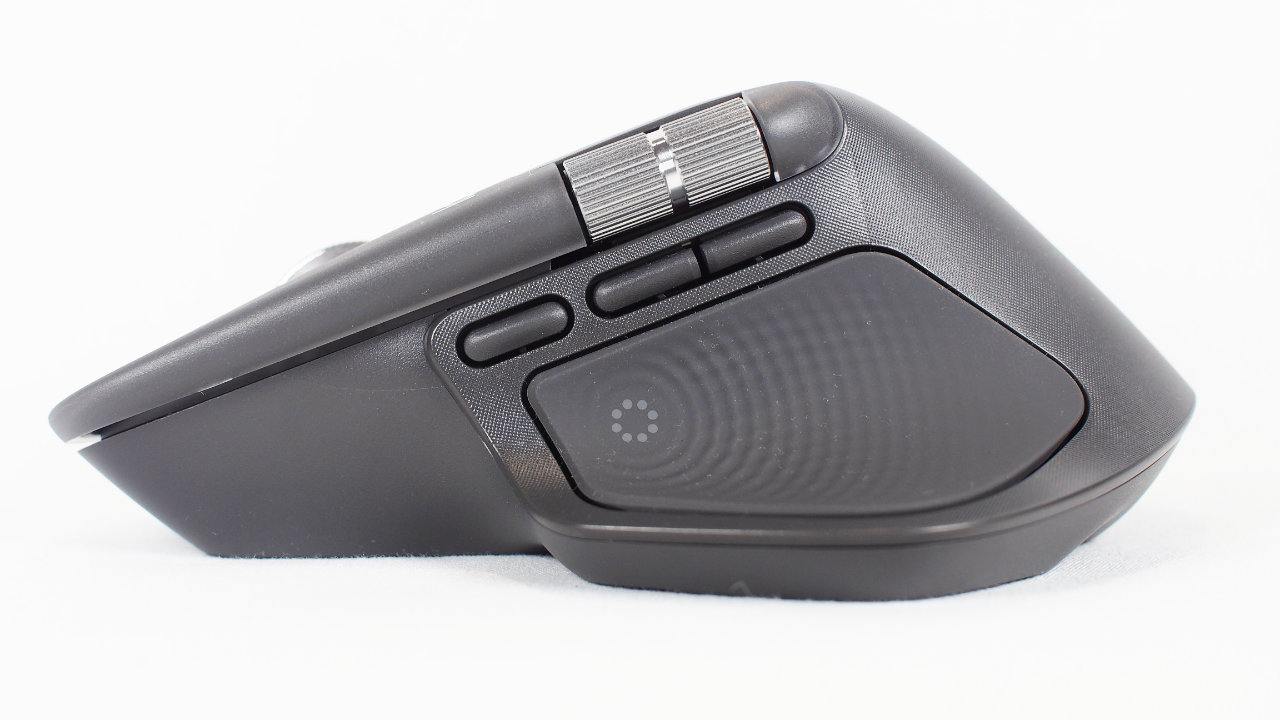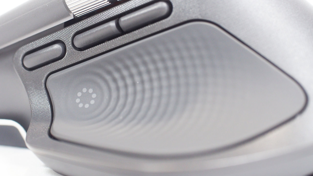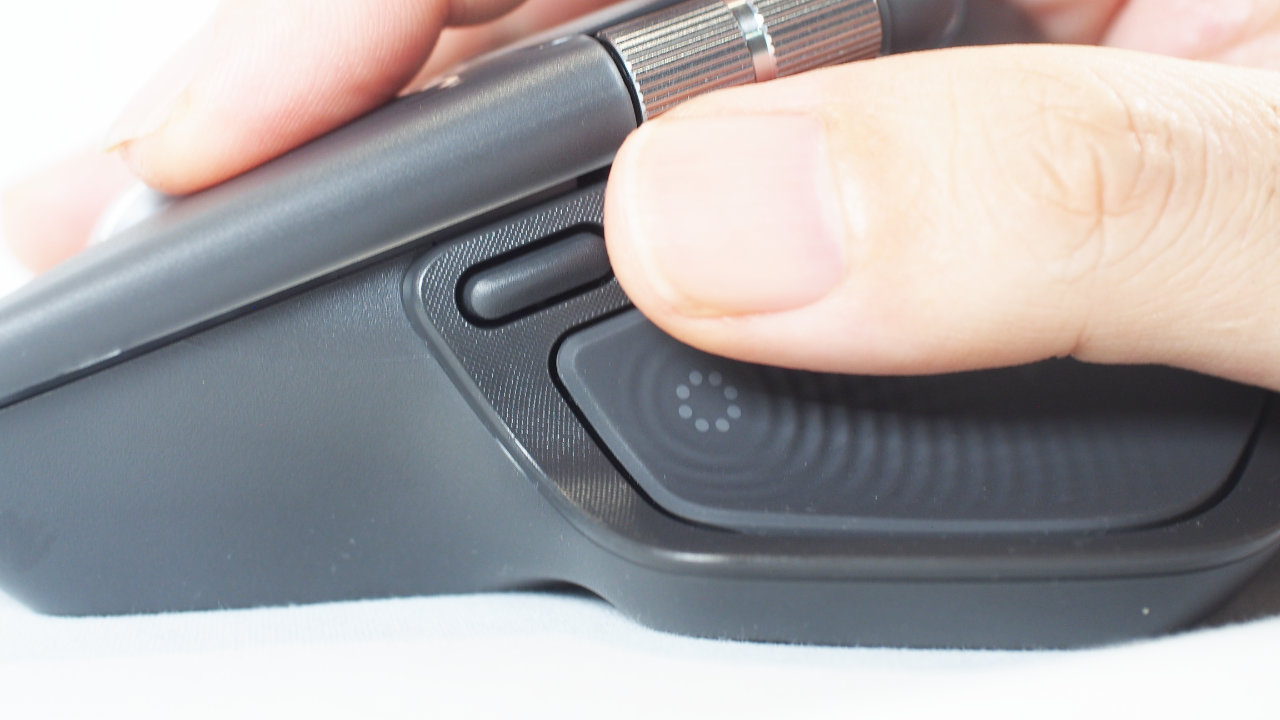 ひと際目立つ大きなボタンはMX Master 4で追加された触覚センサーパネルです。