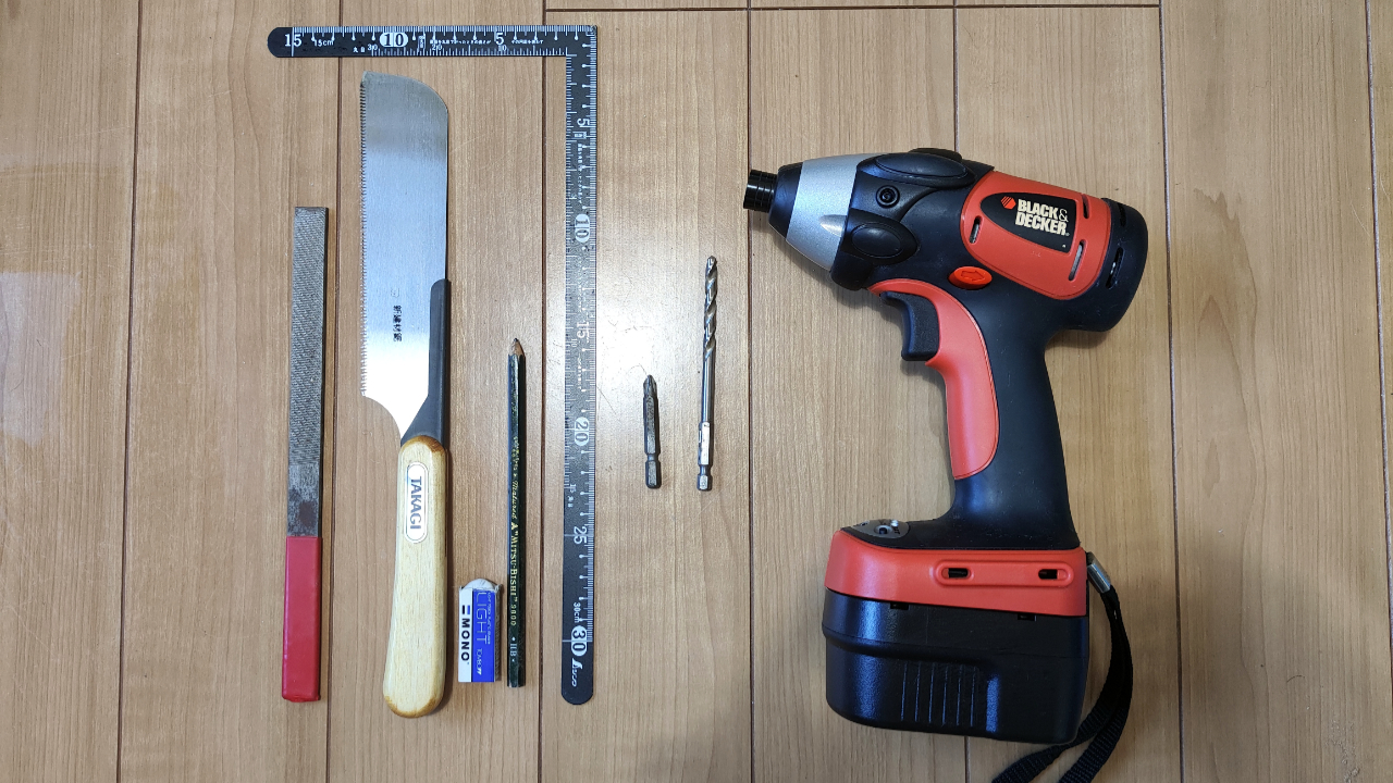 - 電動ドリル(ビットはドリルとプラスドライバー)