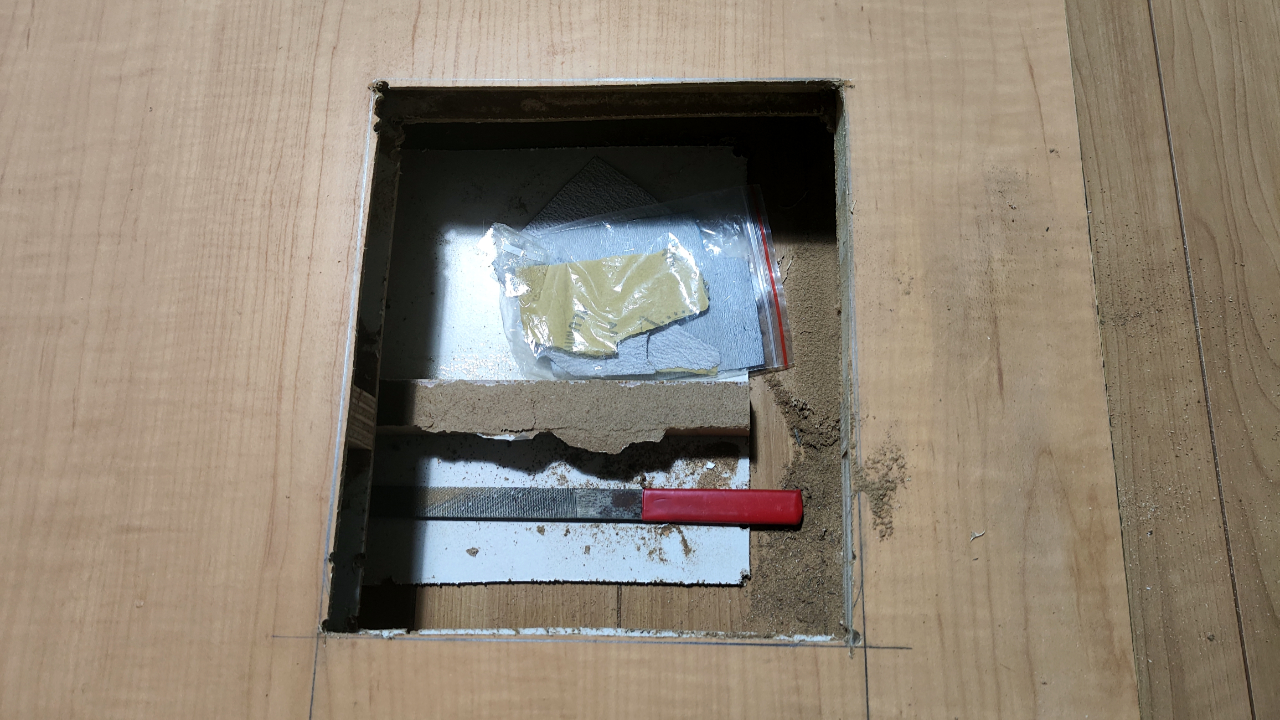 繰り返しますが、ペットドアのパーツが入りやすいように穴は+5mmくらい大きめにあけましょう。