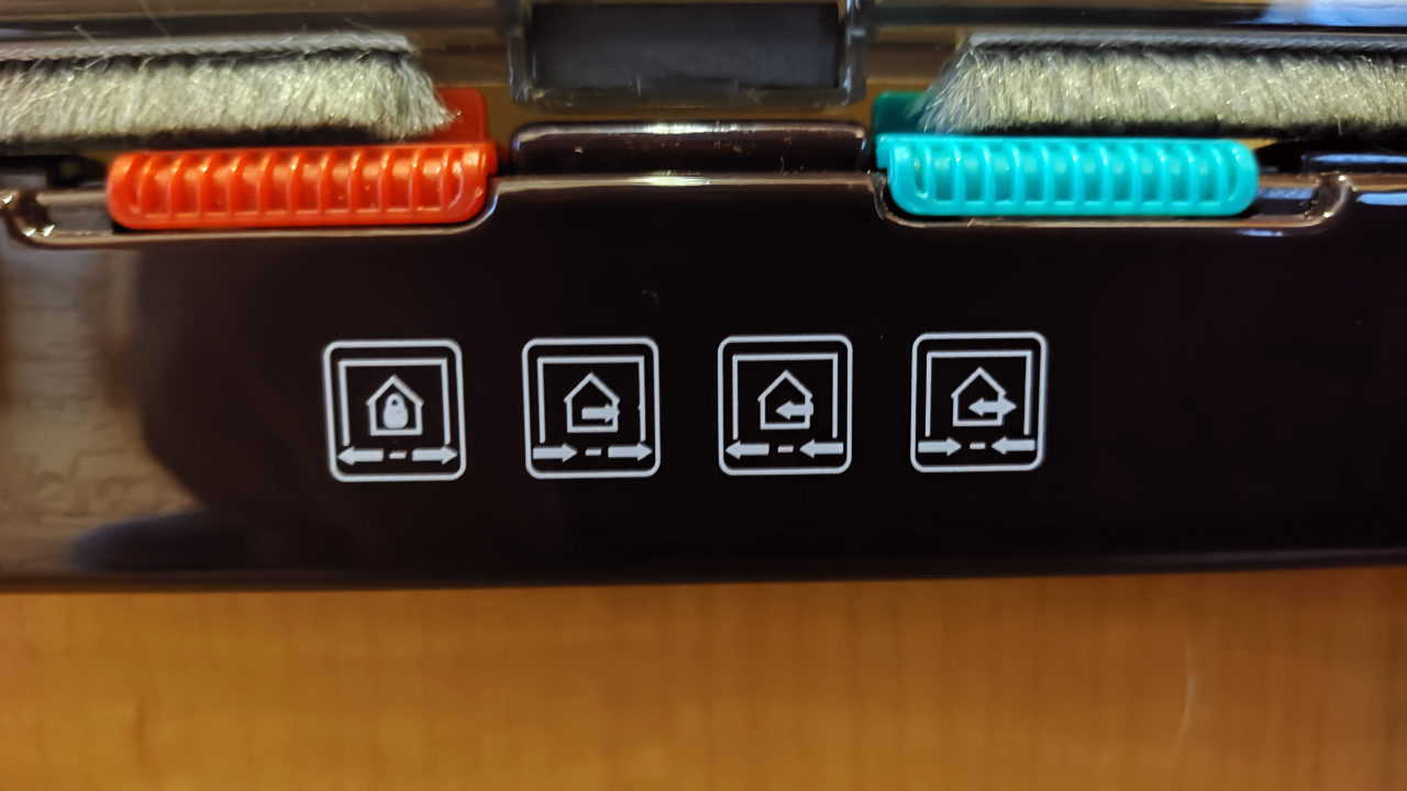 ペットドアの下部に赤色と水色のスライダーがあり、このスライダーの位置でロックが決まります。