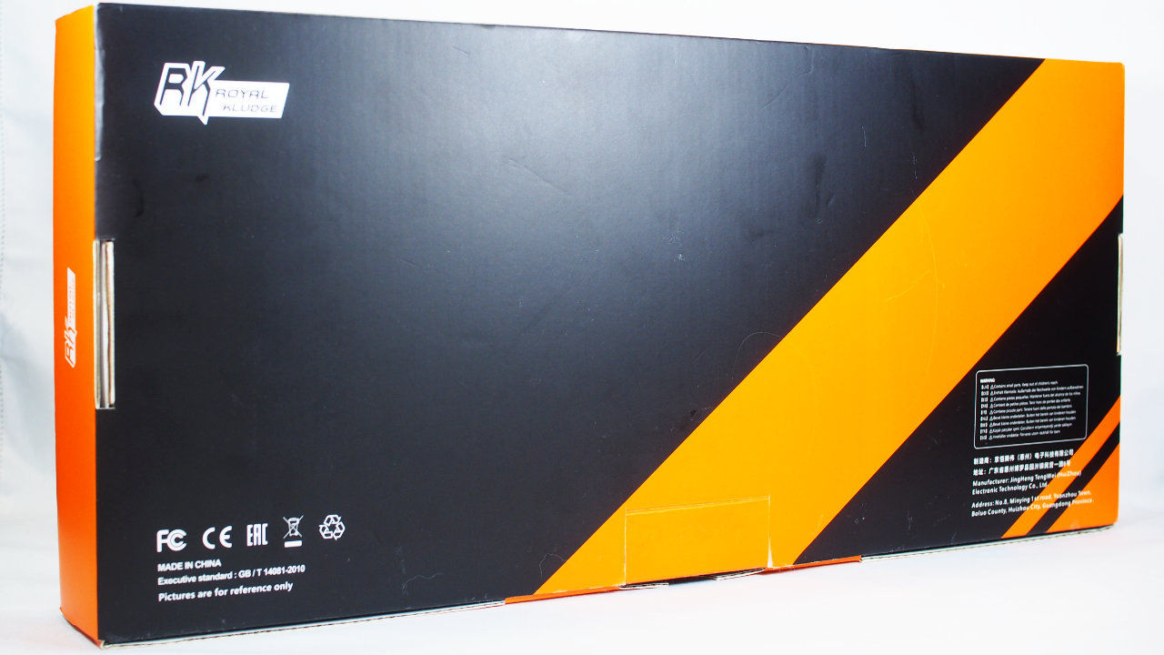 RK ROYAL KLUDGE R98 Proのパッケージは黒とオレンジが特徴的なサイバー感のあるデザインです。
