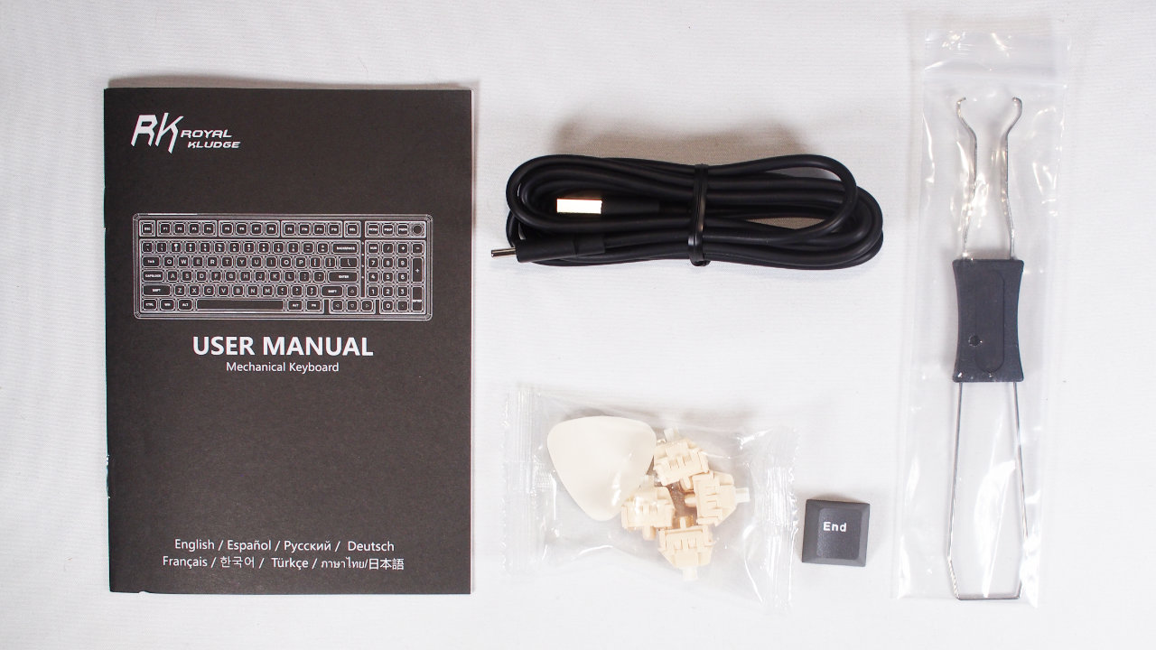付属品は「マニュアル」、「USB Type-Cケーブル」、「キーキャップ・キースイッチの交換用工具」、「予備のキースイッチ」、「ギターピック型のオープナー」、「ENDキー」です。