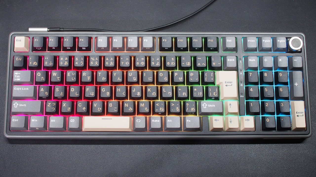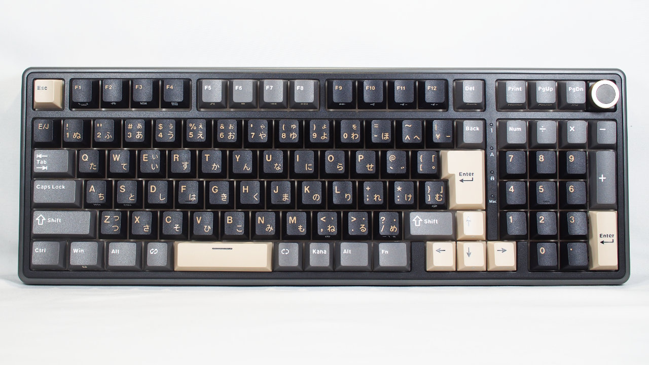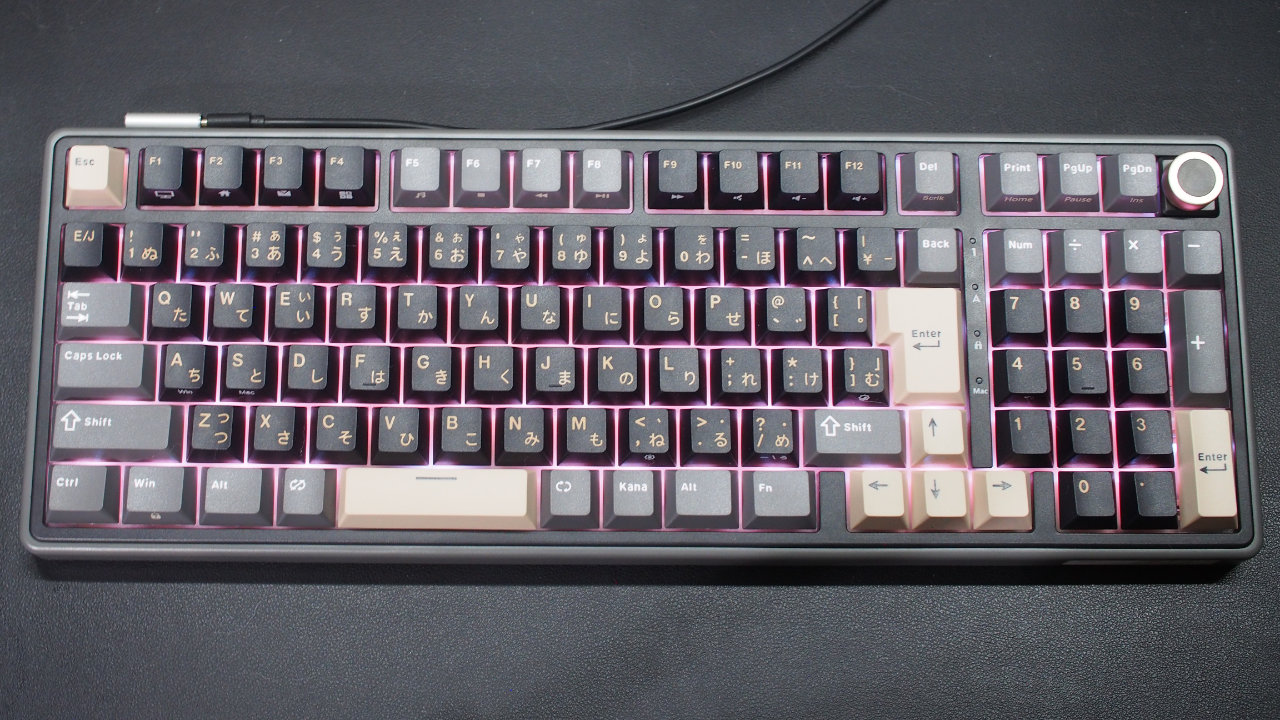 さらに商品名の通り98キータイプ(96%レイアウト)でテンキーを備えているのが特徴で、さらにノブ付きとコトコト系キーボードの日本語配列ではレアな存在です。