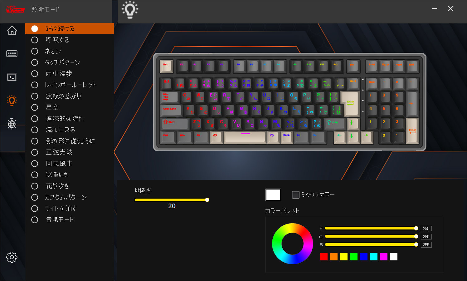 色のカスタマイズはソフトウェア「RK Keyboard」で行います。