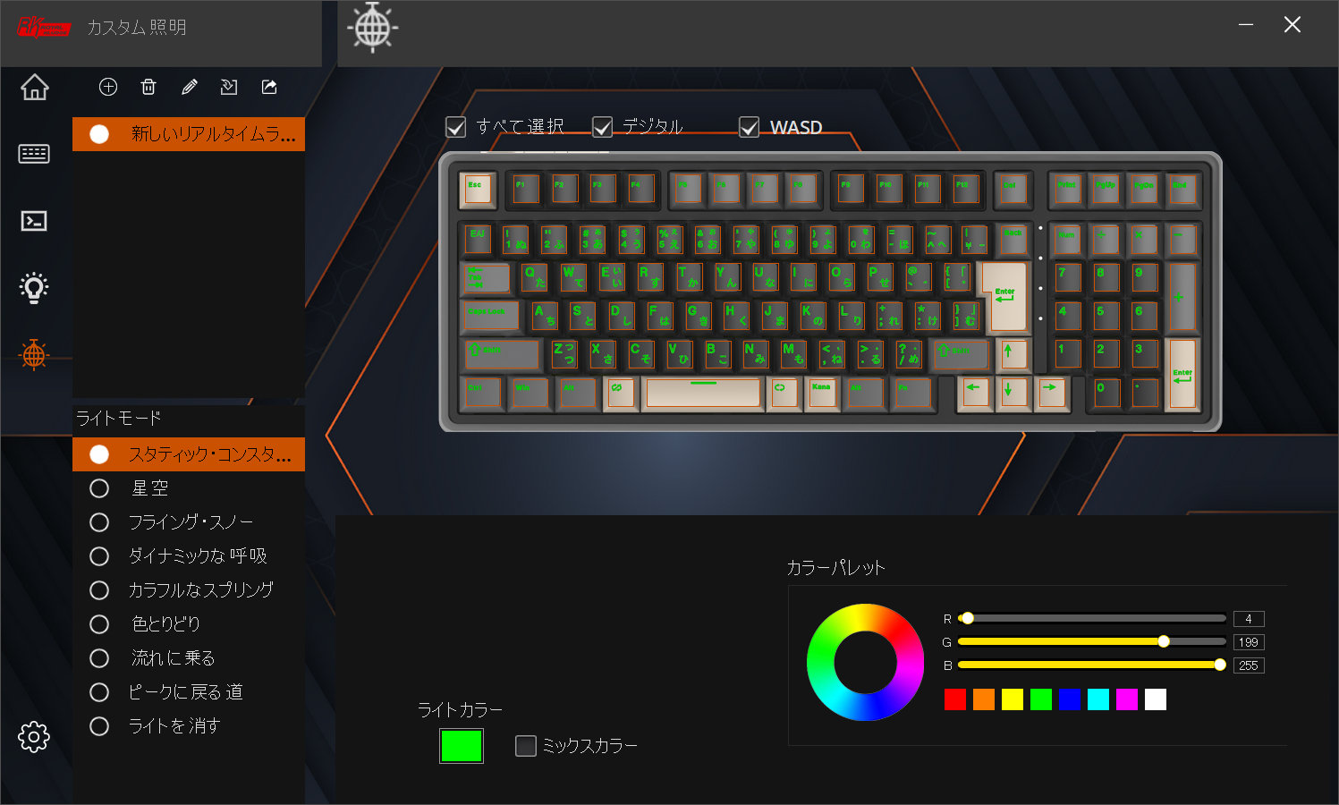ライティングはWASDキーだけを光らせるなどカスタム設定もできます。
