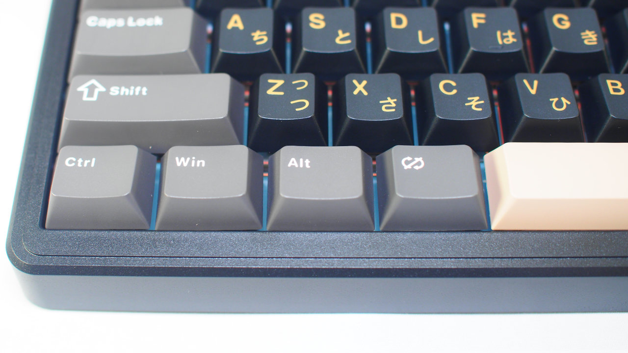 キー配列の最下段のスペースキーの行はキーサイズが一部独特で、スペースキーは3.75Uサイズと小さいのは要注意。