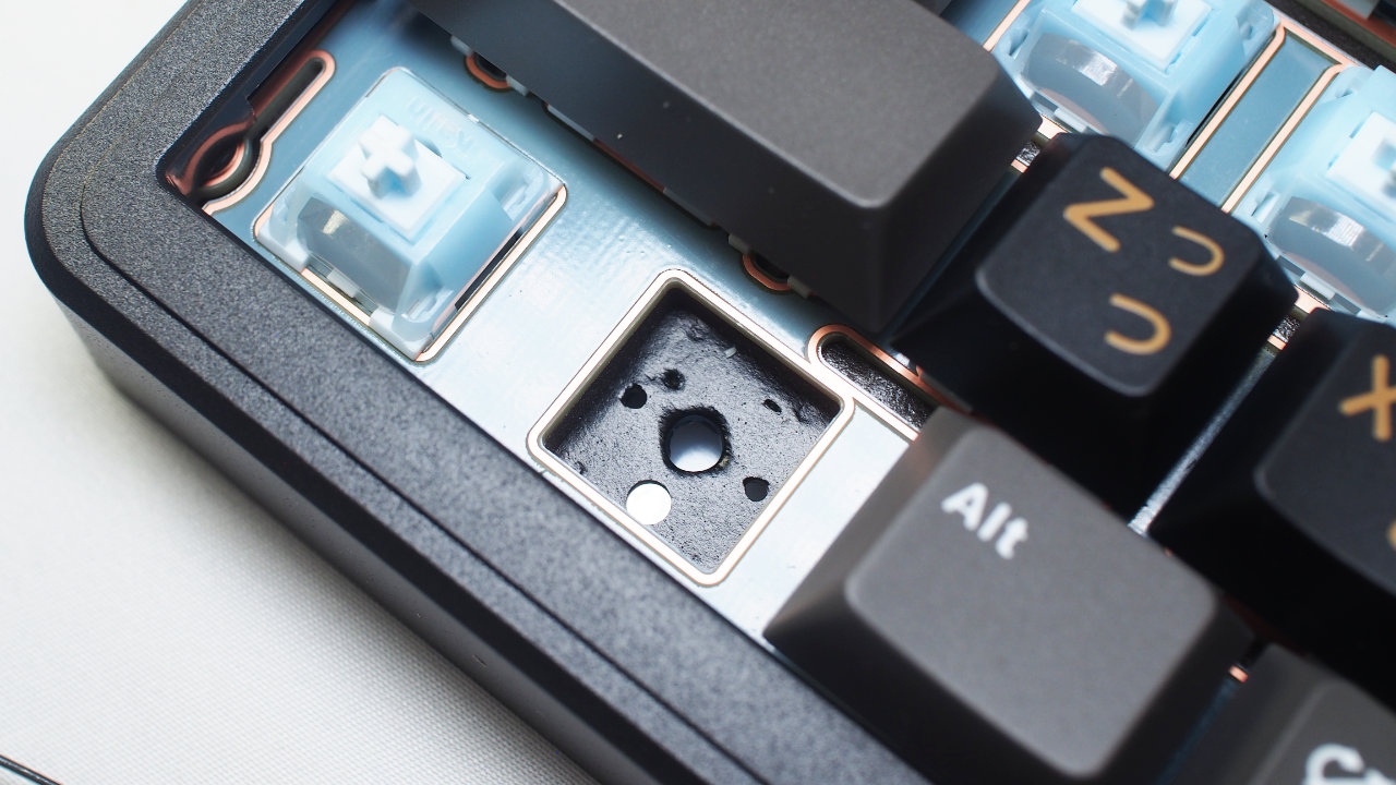 キーキャップを外すとFR4製の水色のプレートとキースイッチが見えます。