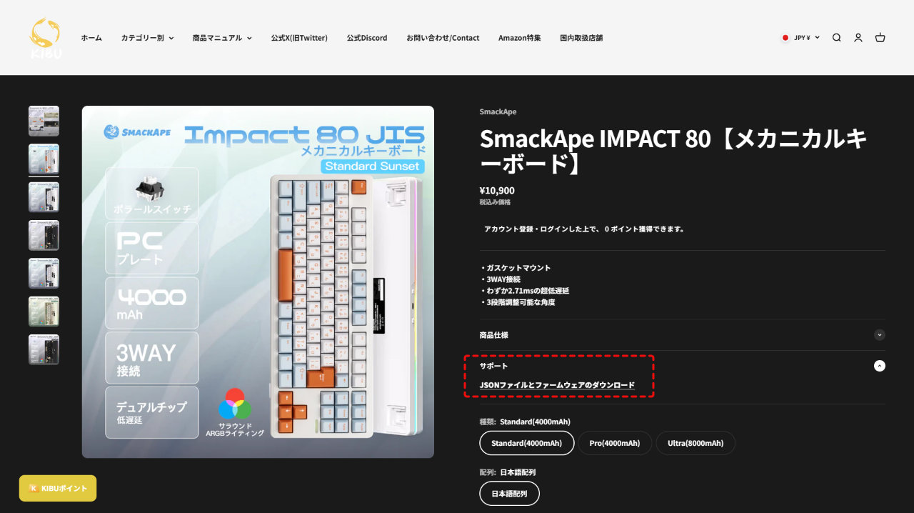 SmackApe Impact 80 JISにはバッテリー容量、キースイッチとプレート素材の違いによりStandard、Pro、Ultraの3モデルがあり、Ultraには4つのバリエーションがあります。