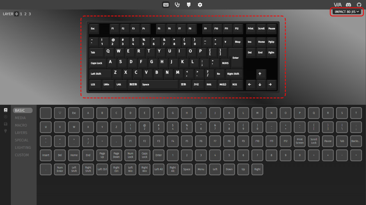 正しくセットアップができれば「Impact 80 JIS」として認識され、キーの配置も反映されます。