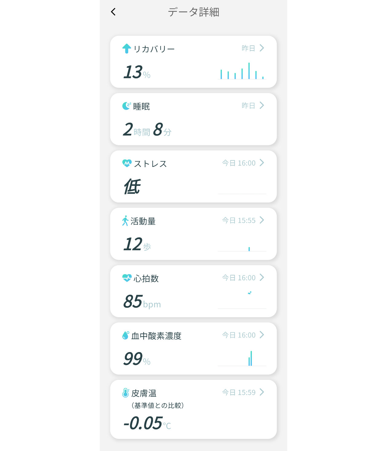 リカバリーのほかに「睡眠時間」「ストレス」「活動量」「心拍数」「血中酸素濃度」「皮膚温」の計測データを確認することができます。