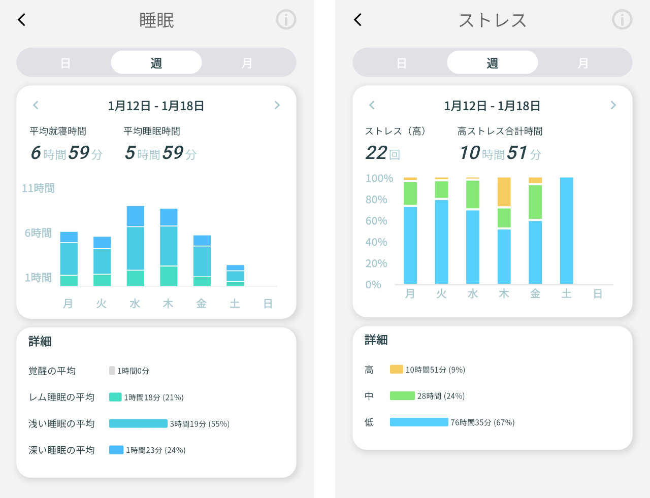 「睡眠」や「ストレス」を週別や月別で表示すると、日々の数値の変化がわかりやすいです。