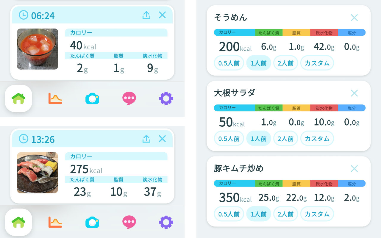 グラスに注いだだけのトマトジュース、お寿司に至ってはネタまで判別してカロリーを算出してくれます。