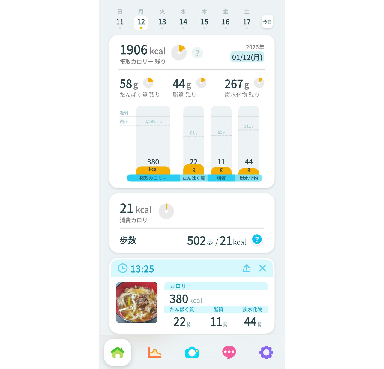 「食事」では、写真を登録したりメニュー名を入力することでカロリーを算出してくれます。