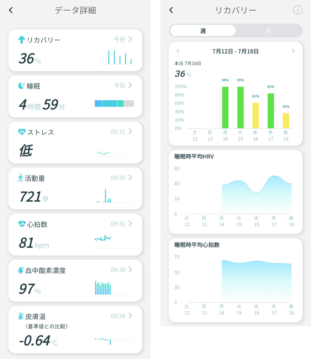 測定値を記録するだけではなく、測定値をベースにしたリカバリーという数値で回復状態を可視化し、ひと目で直感的にわかるようにした点は素晴らしいの一言に尽きます。