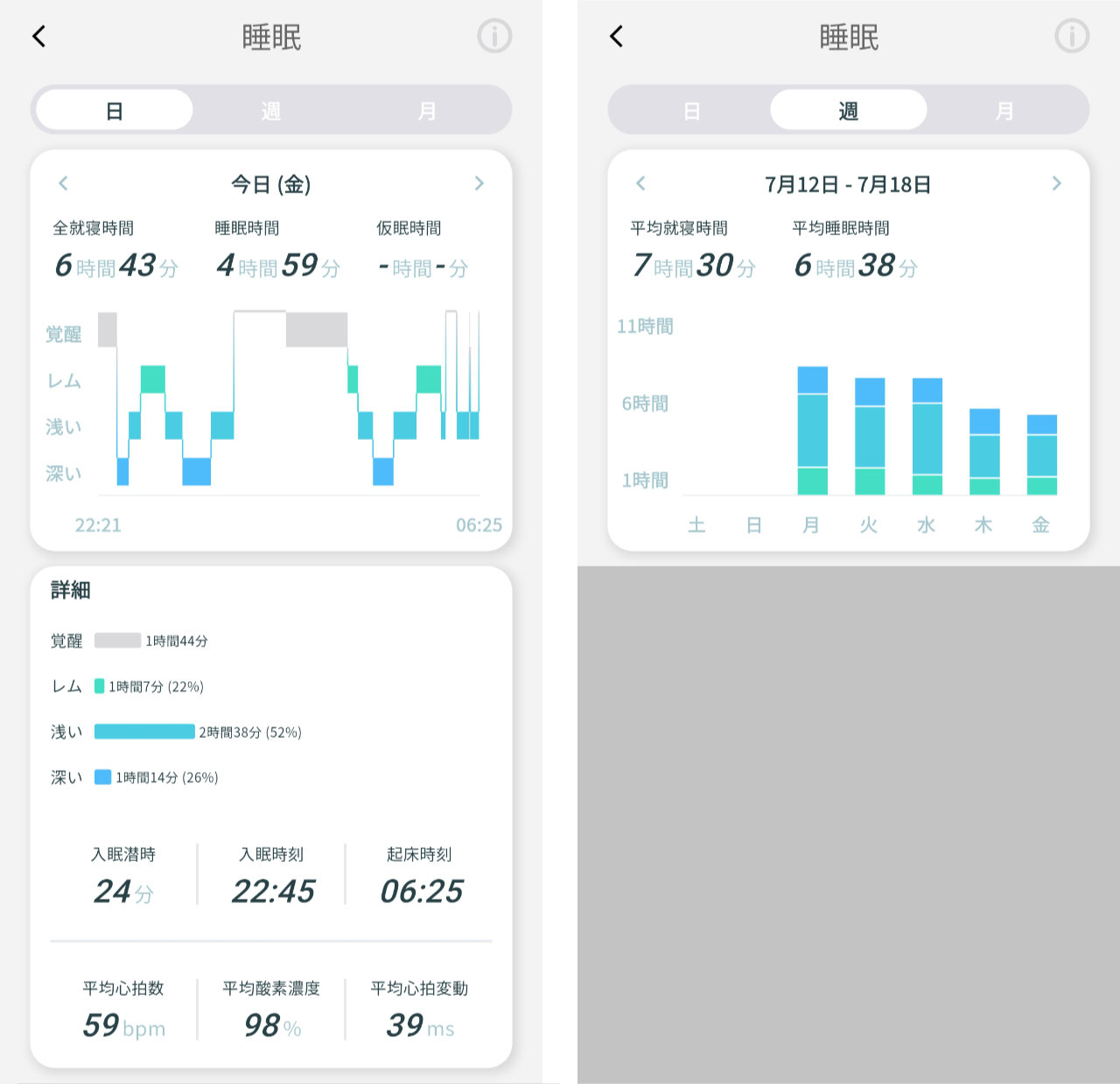 「覚醒」を含め「レム睡眠」「浅い睡眠」「深い睡眠」がグラフで表示されます。