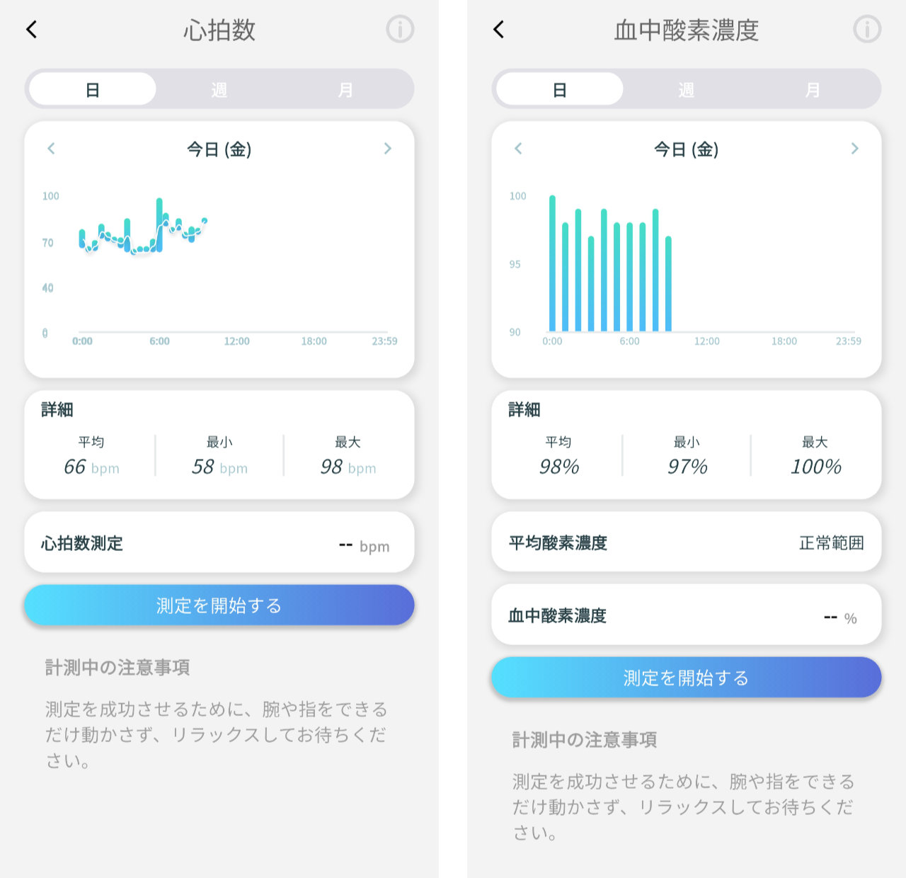 心拍数と血中酸素濃度は好きなタイミングで計測をすることもできます。