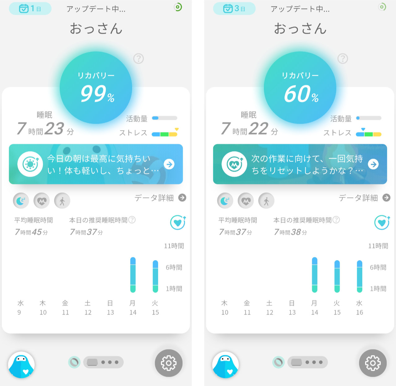 睡眠時間はあまり変わっていませんが、火曜日の「ストレス」が高かったことが影響してか、リカバリーしきれていないことが分かります。