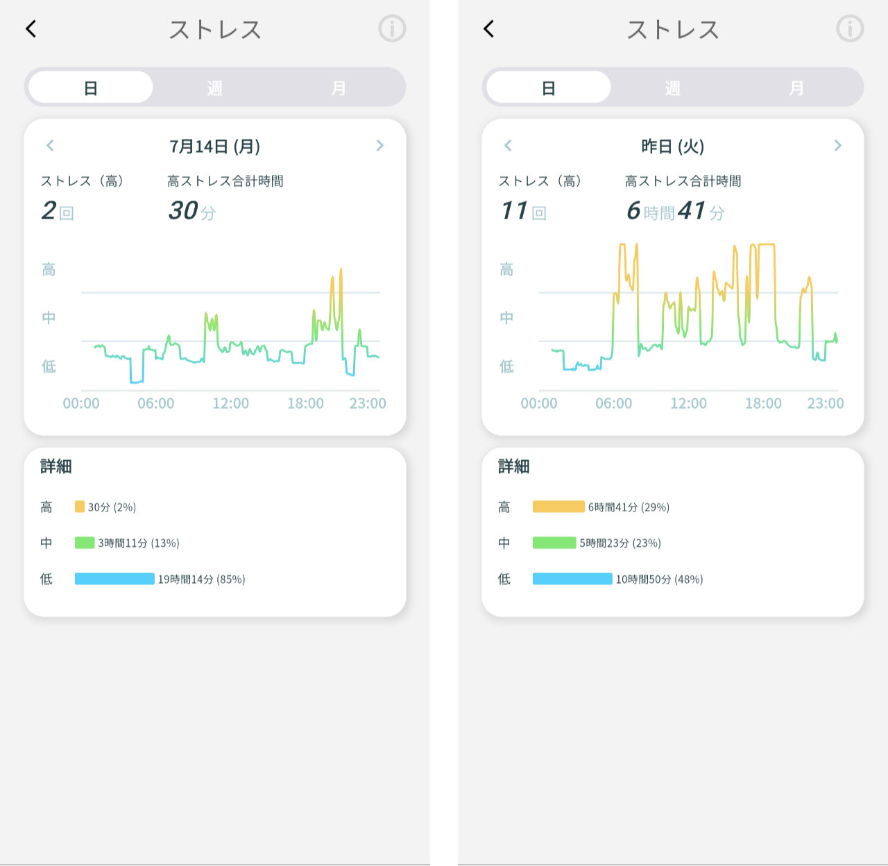 火曜日はストレスが1日中高めで、「ストレス(高)」は11回あったことがわかります。