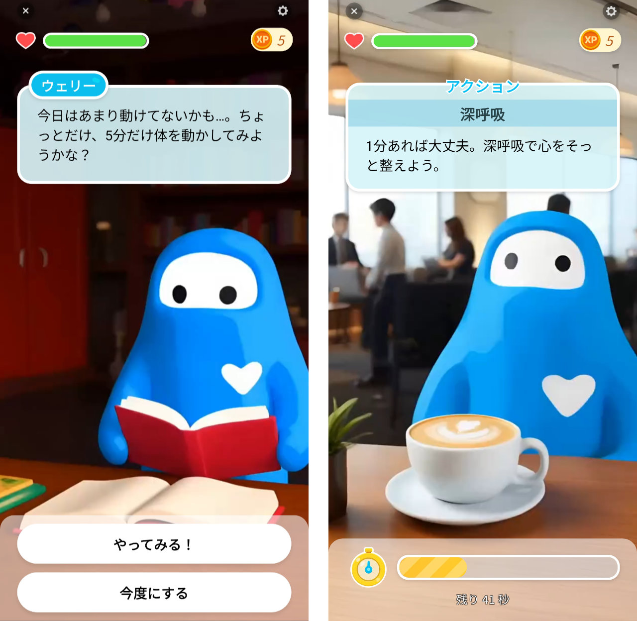 「運動をした方がいいです」とメッセージを表示するだけはなく、ウェリーくんが一緒にしてくれることでゲームのタスクをこなす感覚で行えます。