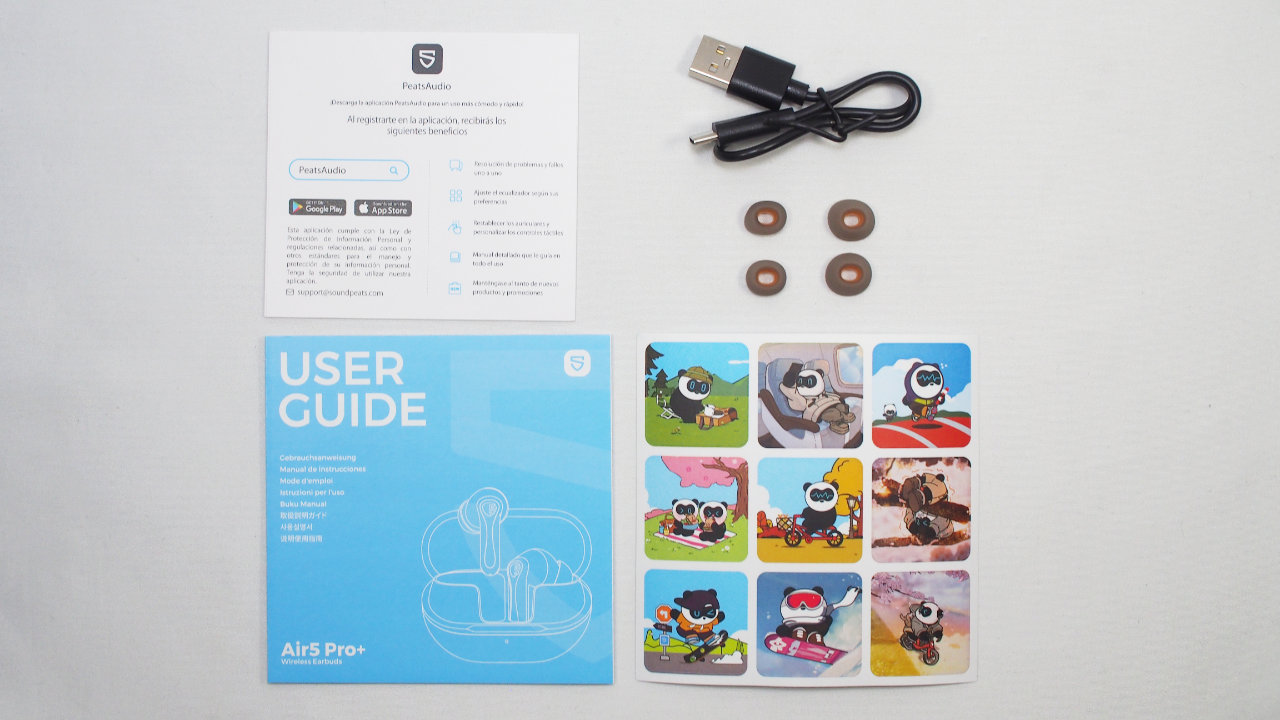 SOUNDPEATS Air5 Pro+の付属品は、PeatsAudioアプリを案内するカードユーザーガイド充電用USBケーブルイヤーピースPEATS君ステッカーです。