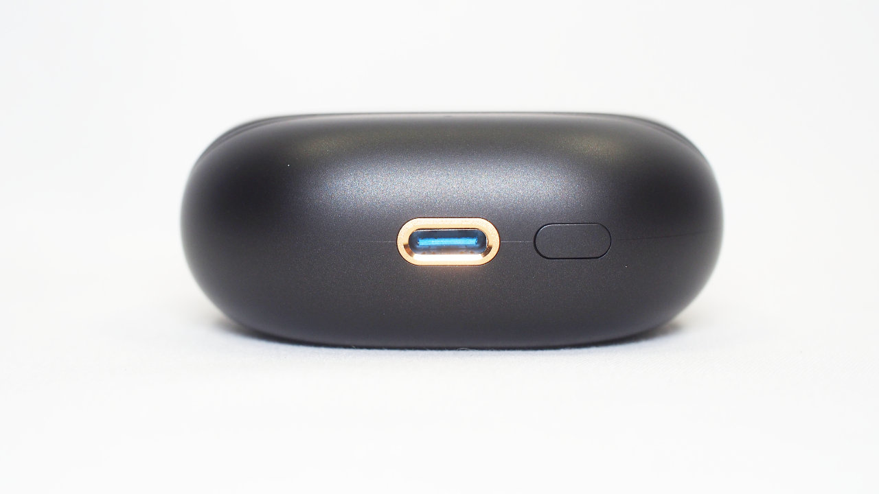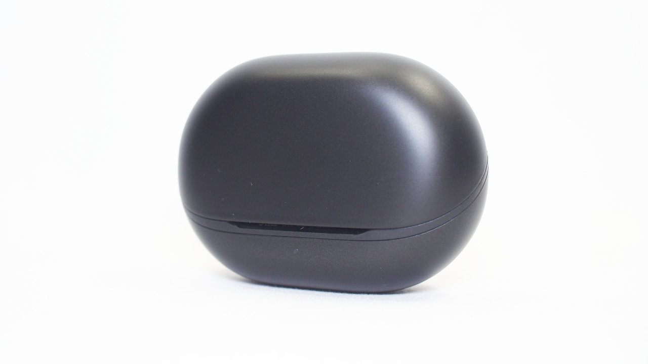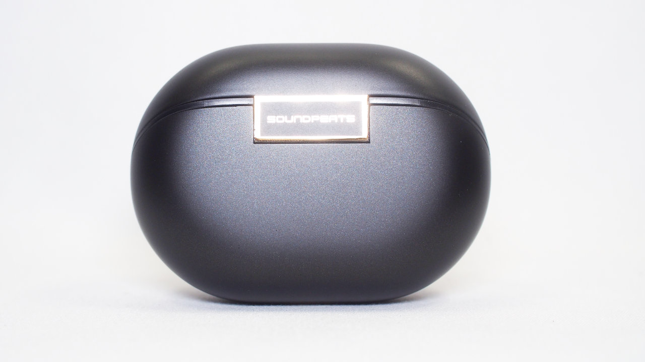 SOUNDPEATS Air5 Pro+のケースはシンプルなデザインで、前面から見ると黒一色でマットな質感です。