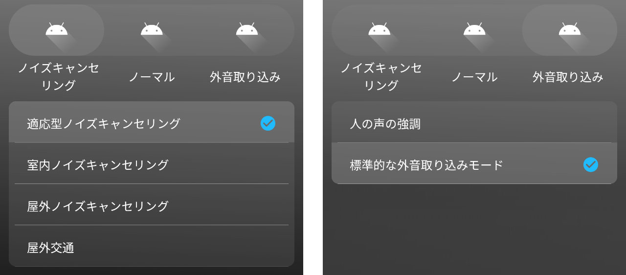 外音取り込みは「人の声の強調」と「標準的な外音取り込みモード」の2種類があります。