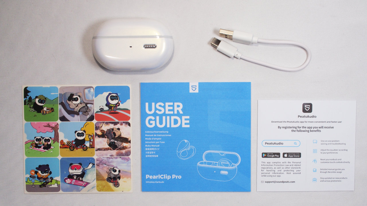 本体のほか、付属品としてマニュアル、充電用のUSB Type-Cケーブル、PeatsAudioアプリの案内、PEATS君のステッカーが付いています。