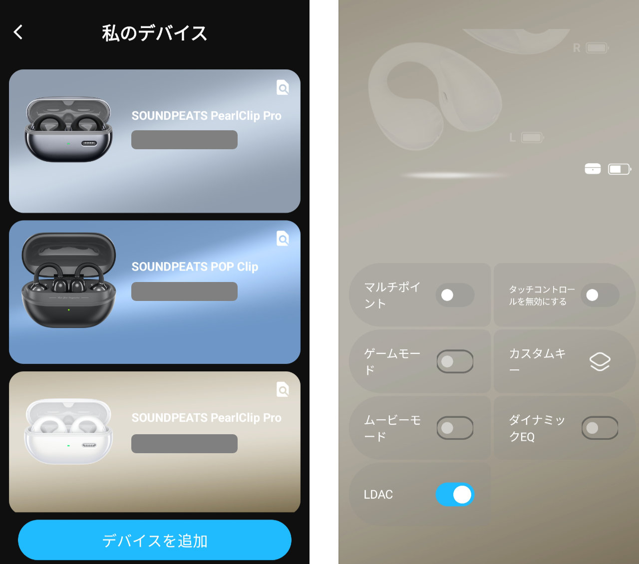 デバイス名は「SOUNDPEATS PearlClip Pro」で、SOUNDPEATS CCの元のモデル名で表示されます。