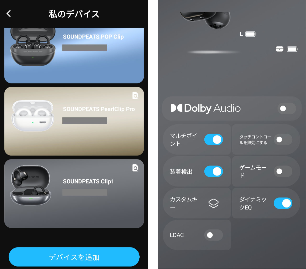 PeatsAudioアプリの「デバイスを追加」からSOUNDPEATS Clip1を選ぶだけです。SOUNDPEATS Clip1には「Dolby Audio」や「ダイナミックEQ」、「LDAC」の設定もあります。