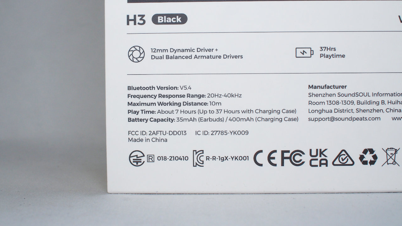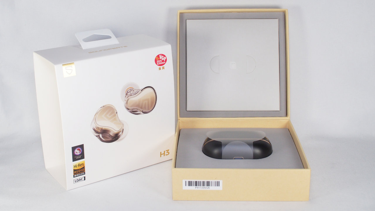 ホワイト基調のパッケージに、ゴールドでSOUNDPEATSのロゴとモデル名のH3があしらわれていて高級感があります。