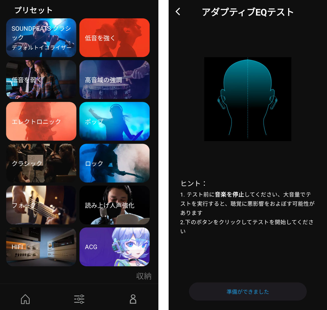あらかじめ調整された12個のプリセットイコライザー、ユーザー環境にあわせて調整してくれるアダプティブEQ、好みの調整ができるカスタムEQが準備されています