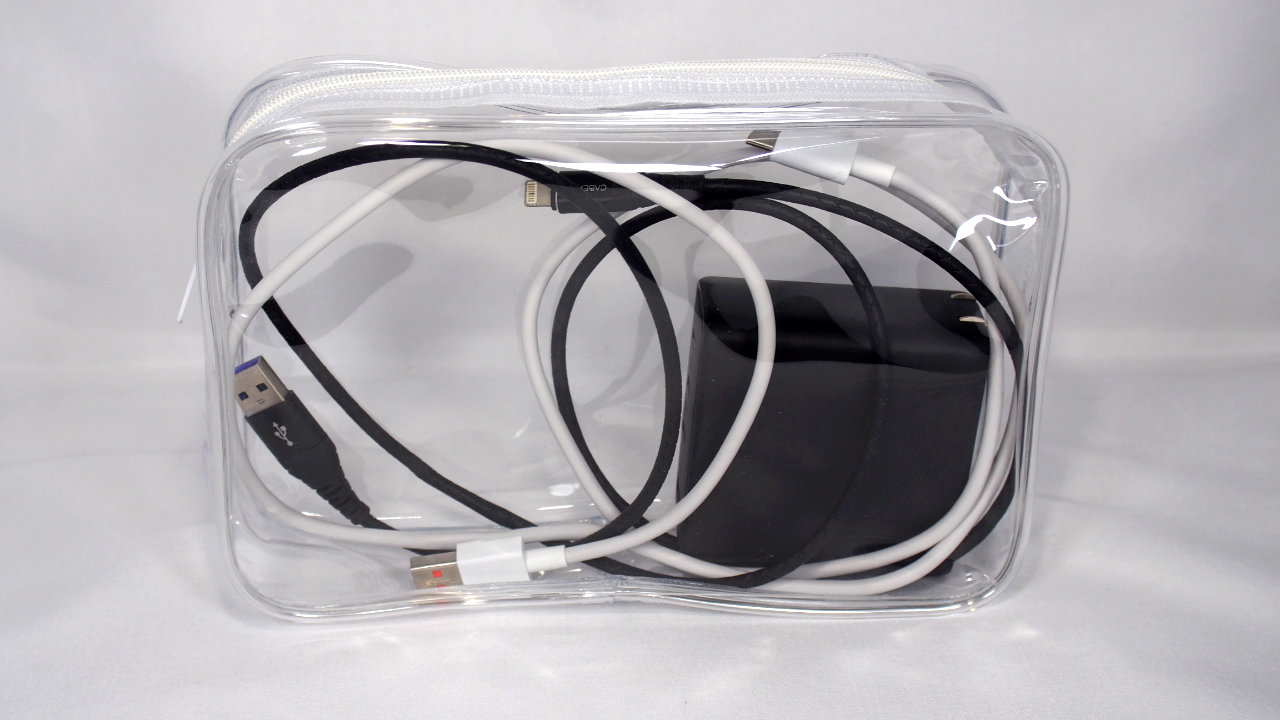 透明のポーチに、充電器とまとめた1mのケーブルを2本入れてみました。