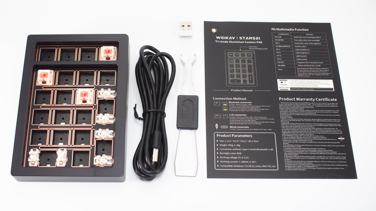 付属品はあらかじめ装着された状態のキースイッチ×3、USBケーブル、ワイヤレスレシーバー、キープラー(引き抜き工具)、マニュアル(カード)です。