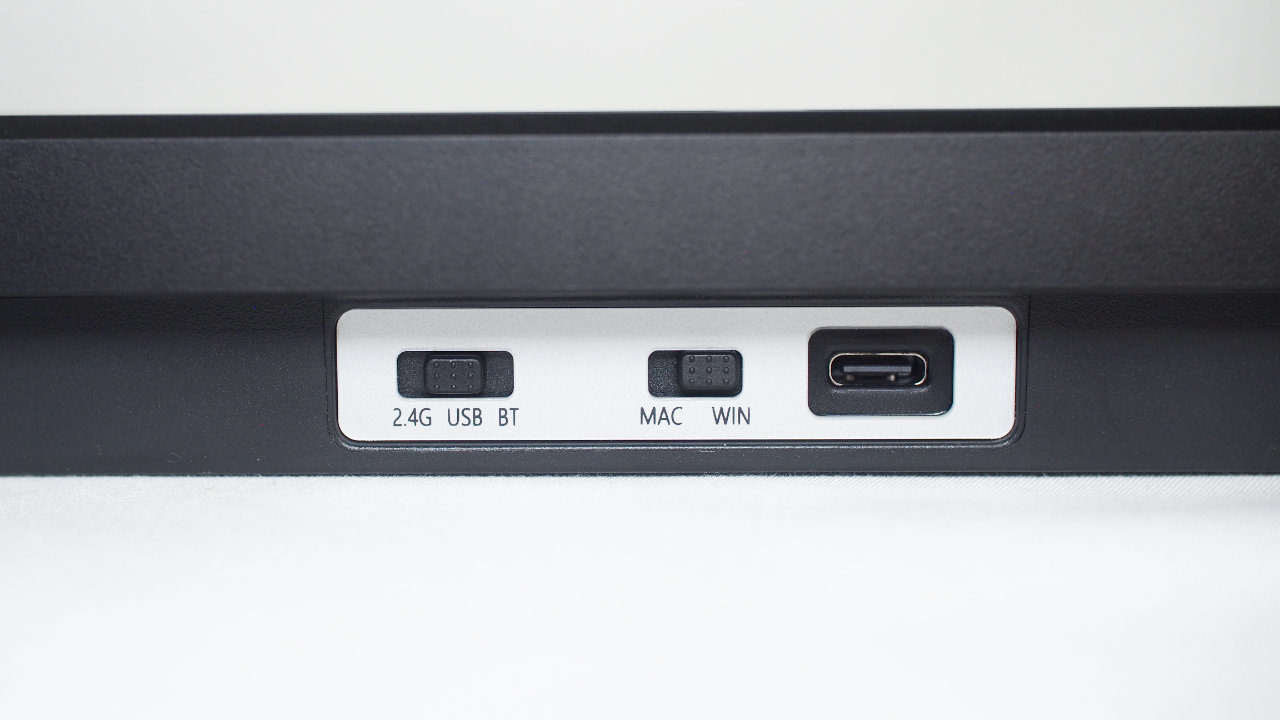 背面には接続方式の切替ボタンとWindows / Macの切替ボタン、USBポートが集約して配置されています。